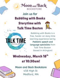 Wednesday, March 18th at 10:30am: Talk Time Boston (pediatric speech and language specialists) joins us for Babbling with Books storytime